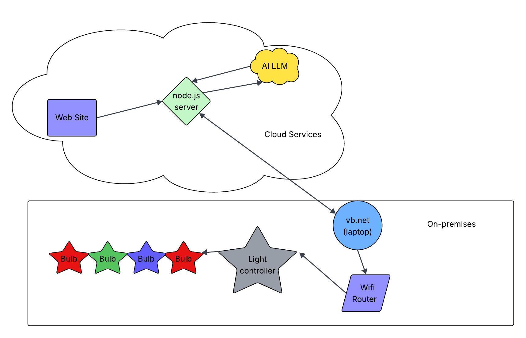 1) I updated the lights with the ability to communicate with an LLM (Claude Sonnet) and allow visitors to create their own patterns using plain language -- which Claude converts into a string of commands that are converted into the electronic signals sent to the lights. With an LLM, not only can English be used (many languages, actually) -- but also programming languages. That completes one of the goals I had back in 2017.