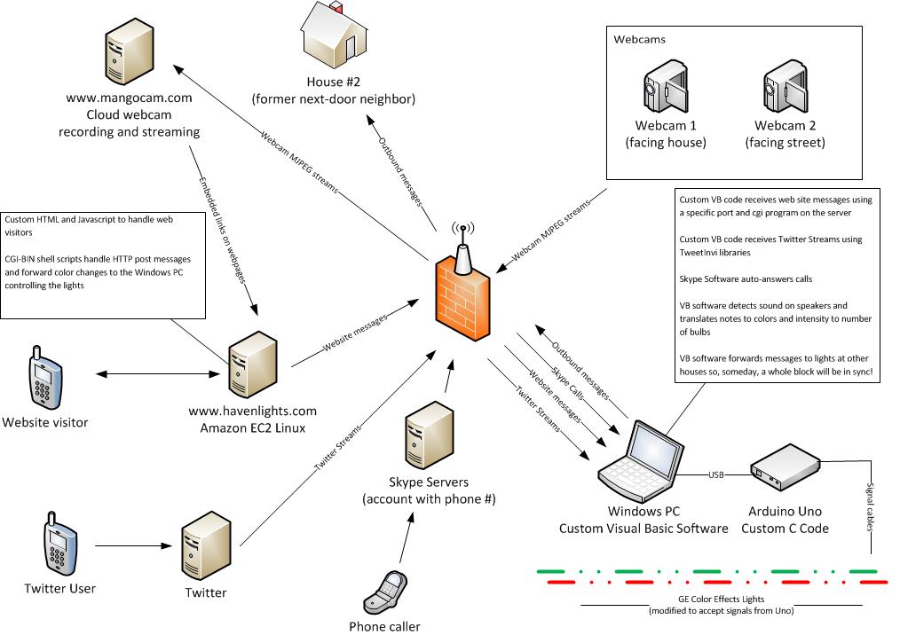 So next I built a Visual Basic program that communicates with the Arduino box, and set it up to subscribe to messages from Twitter. After a few weeks, I discovered that only maybe 2 people in the neighborhood actually had a Twitter account. So I added a web site. That is where it took off -- we would get a few folks, each week, stopping in front of the house and playing around.